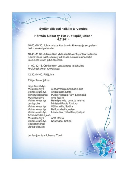 Pääjuhla alkoi klo 12.30 lippujen saapumisella juhlasaliin. Kuva: Anne Katajamäki |  Alahärmän puhallinorkesteri säesti juhlassa. Kuva: Mira Niemi |  Juhlan juonsi Johanna Tuuri. Kuva: Anne Katajamäki |